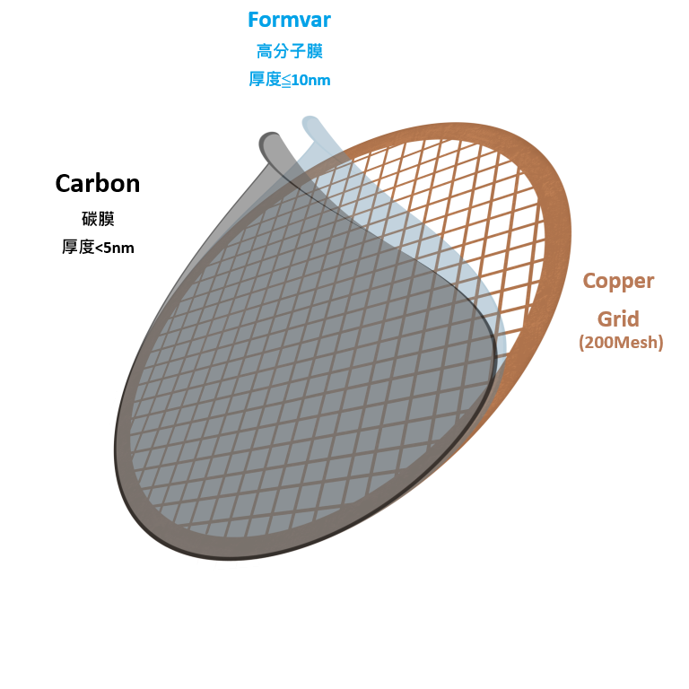 透過在銅網上覆蓋 Formvar高分子支撐膜 並鍍上一層超薄碳膜,
